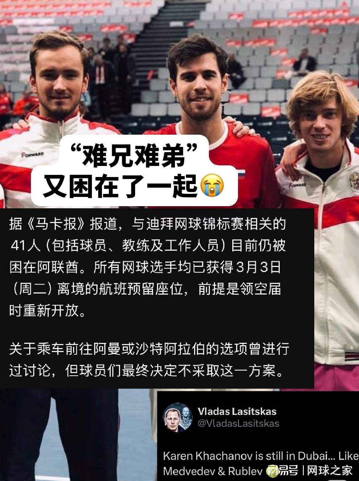 为了不影响印第安维尔斯大师赛的顺利开展,ATP也迅速给出了这41人离开迪拜的两个撤离方案:一是乘车6小时走阿曼这条路;二是乘车10小时从沙特利雅得搭乘飞机离开。